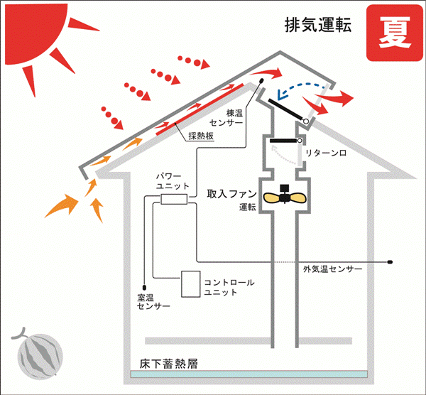 制御盤は 棟温・室温・外気温 の3つの温度を感知して季節に応じて、大きく4つのはたらきを自動的にコントロールします。 自然エネルギー・太陽熱を上手に利用します。