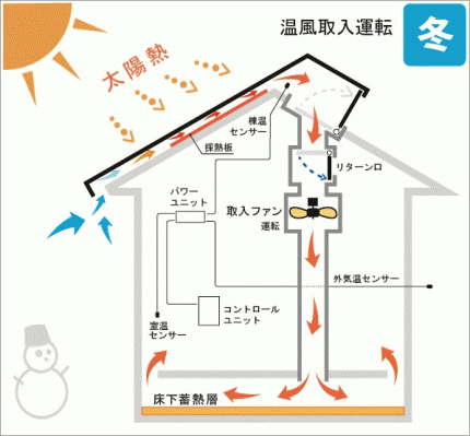 軒先から入ってきた空気は、屋根の集熱面で暖められ自動的にファンで床下に送り込み、基礎のコンクリートを時間をかけてゆっくりと暖めて蓄熱する。床下の温風は床下一面に広がり、やがて吹出口から室内に出て床表面と家全体を暖める。